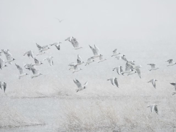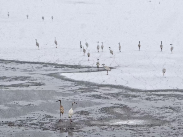 4月5日清明时节,吉林镇赉莫莫格湿地迎来降雪。漫天飞雪中,白鹤、黑尾塍鹬、灰鹤等珍稀候鸟悠然觅食、翩跹起舞,勾勒出“中国白鹤之乡”生机盎然的生态图景。