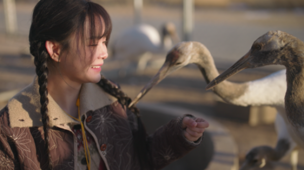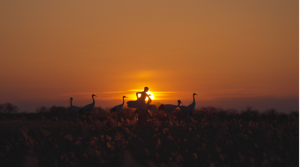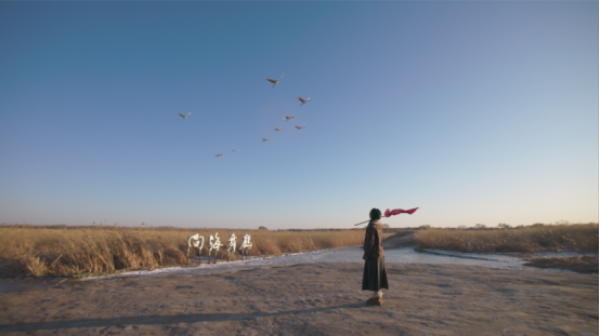 在向海的日子,每个放鹤的清晨,江寻千都与仙鹤翩翩起舞,抬手,转身,回眸,每一个动作都反复打磨,直到形、神合一。江寻千的镜头,也记录下这一切。她用唯美治愈的画面,将鹤舞的形态与向海的自然风光深度融合。镜头里,丹顶鹤掠过夕阳,舞者的衣袂随风飘扬,蒲草苇荡掀起金色的波浪。那不是表演,是这片土地上千百年来生生不息的日常。
